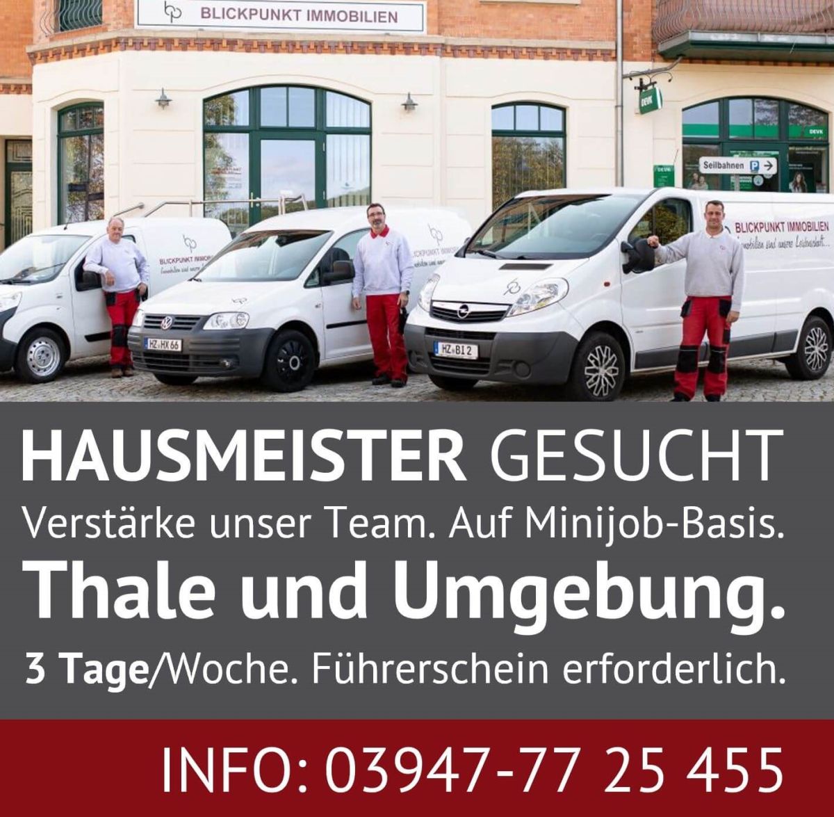 Für Thale und Umgebung suchen wir einen Hausmeister auf Minijob-Basis. Für 3 Tage/Woche. Führerschein ist erforderlich. Bitte einfach einrufen: 03947-77 25 455.